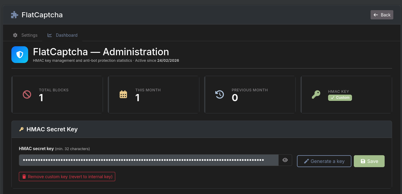 - Access the admin dashboard via Admin → Plugins → FlatCaptcha → Admin view.