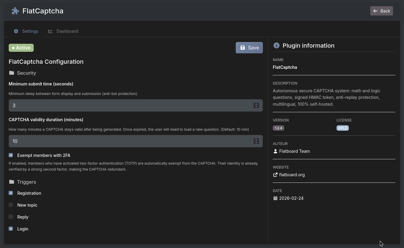 - 2FA exemption — members who have enabled Flatboard's two-factor authentication (TOTP) can be automatically exempt from the CAPTCHA (configurable)