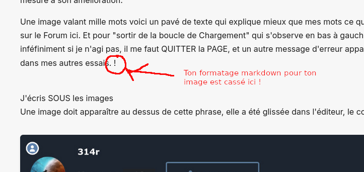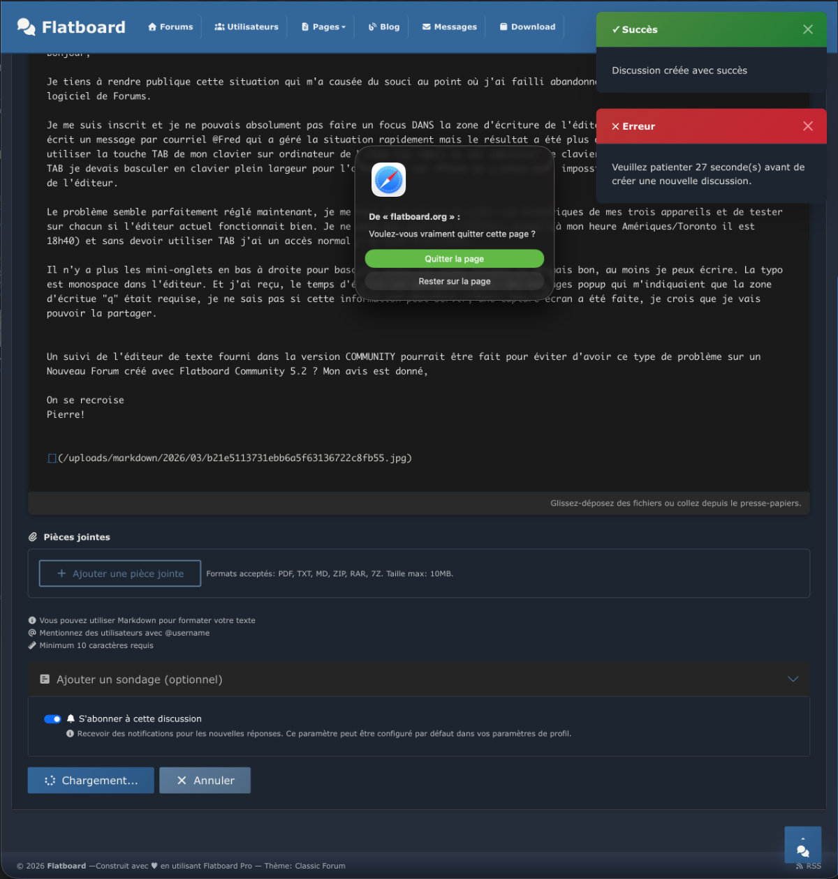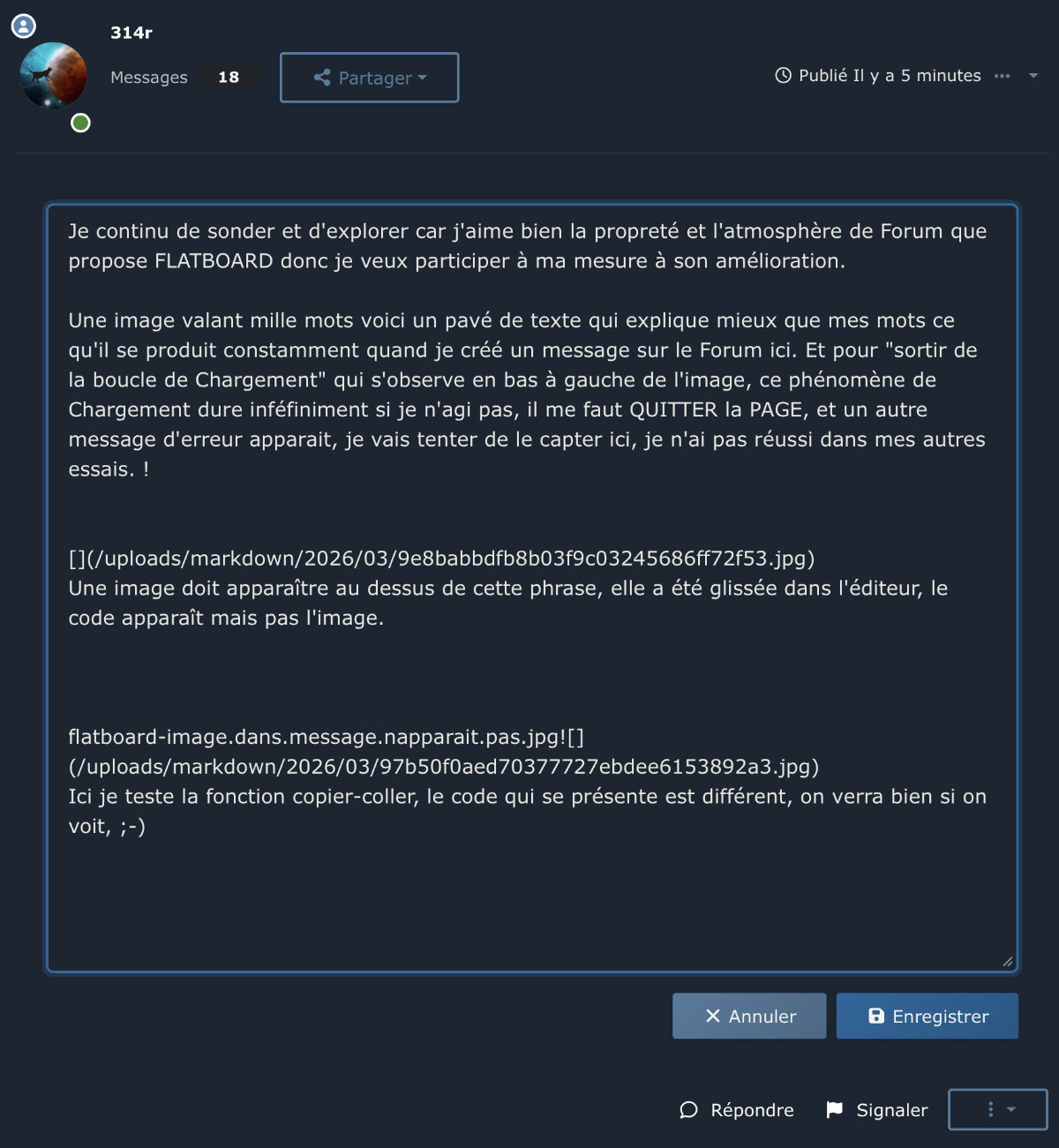 Une image valant mille mots voici un pavé de texte qui explique mieux que mes mots ce qu'il se produit constamment quand je créé un message sur le Forum ici. Et pour "sortir de la boucle de Chargement" qui s'observe en bas à gauche de l'image, ce phénomène de Chargement dure inféfiniment si je n'agi pas, il me faut QUITTER la PAGE, et un autre message d'erreur apparait, je vais tenter de le capter ici, je n'ai pas réussi dans mes autres essais.