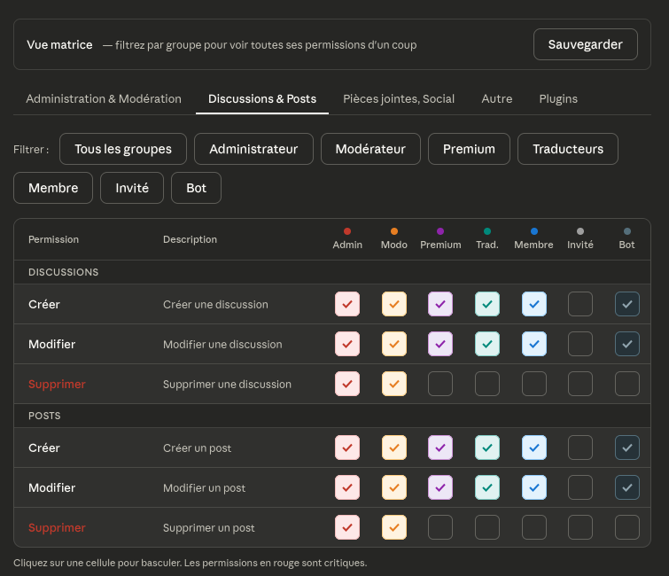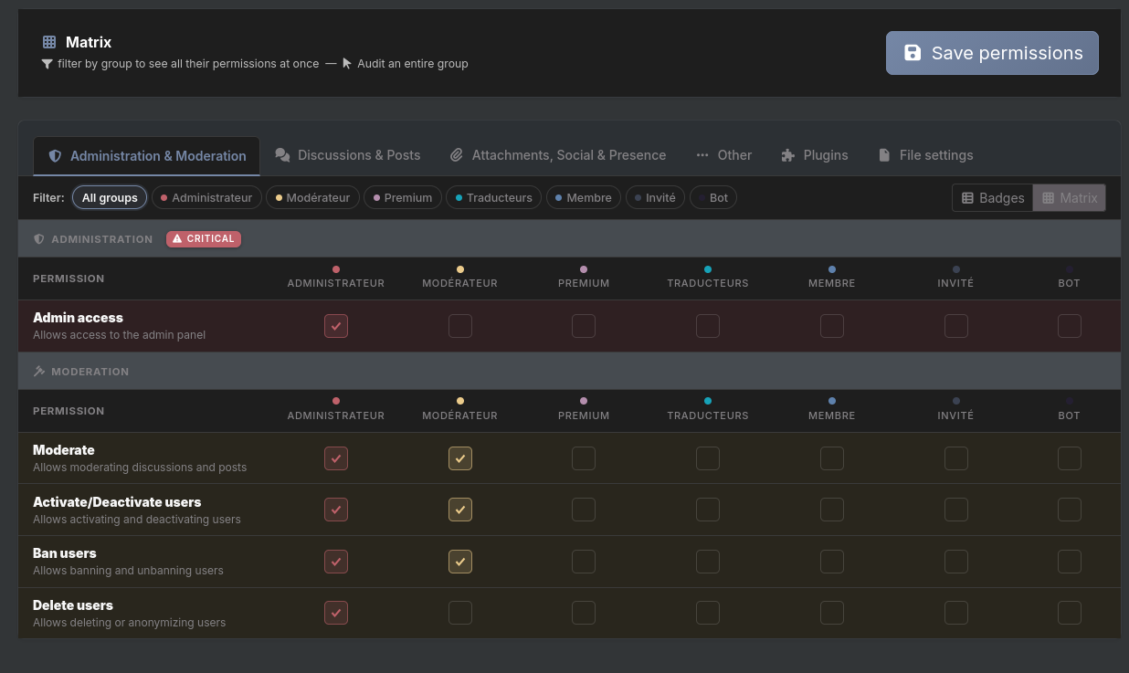 For example, clicking Moderator in the filters would isolate that column and show all its permissions across the current tab.