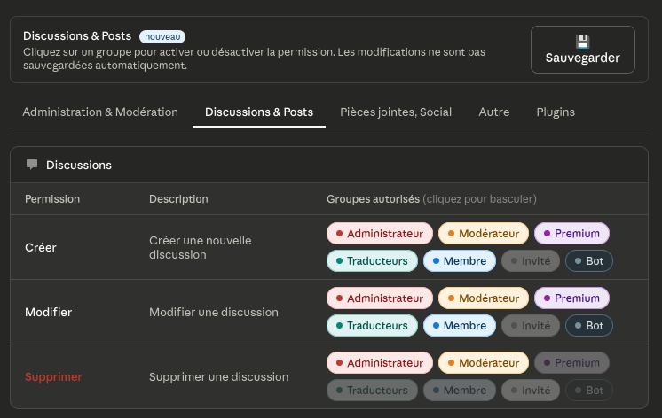 Avec ce que la traduction me permet de comprendre et les images qui donnent envie de creer des groupes speciaux, un petit plugin qui ajouterait ce module au tableau d´administration serait bienvenu