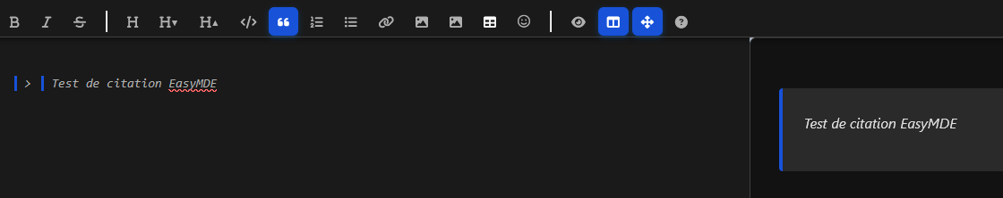 la dernière fois que j'ai essayé, la fonction citation de easymde n'a collé qu'un seul "|>" sans le "|" qui permet de bien formater la citation, du coup, la citation n'apparaissait pas comme elle devait.